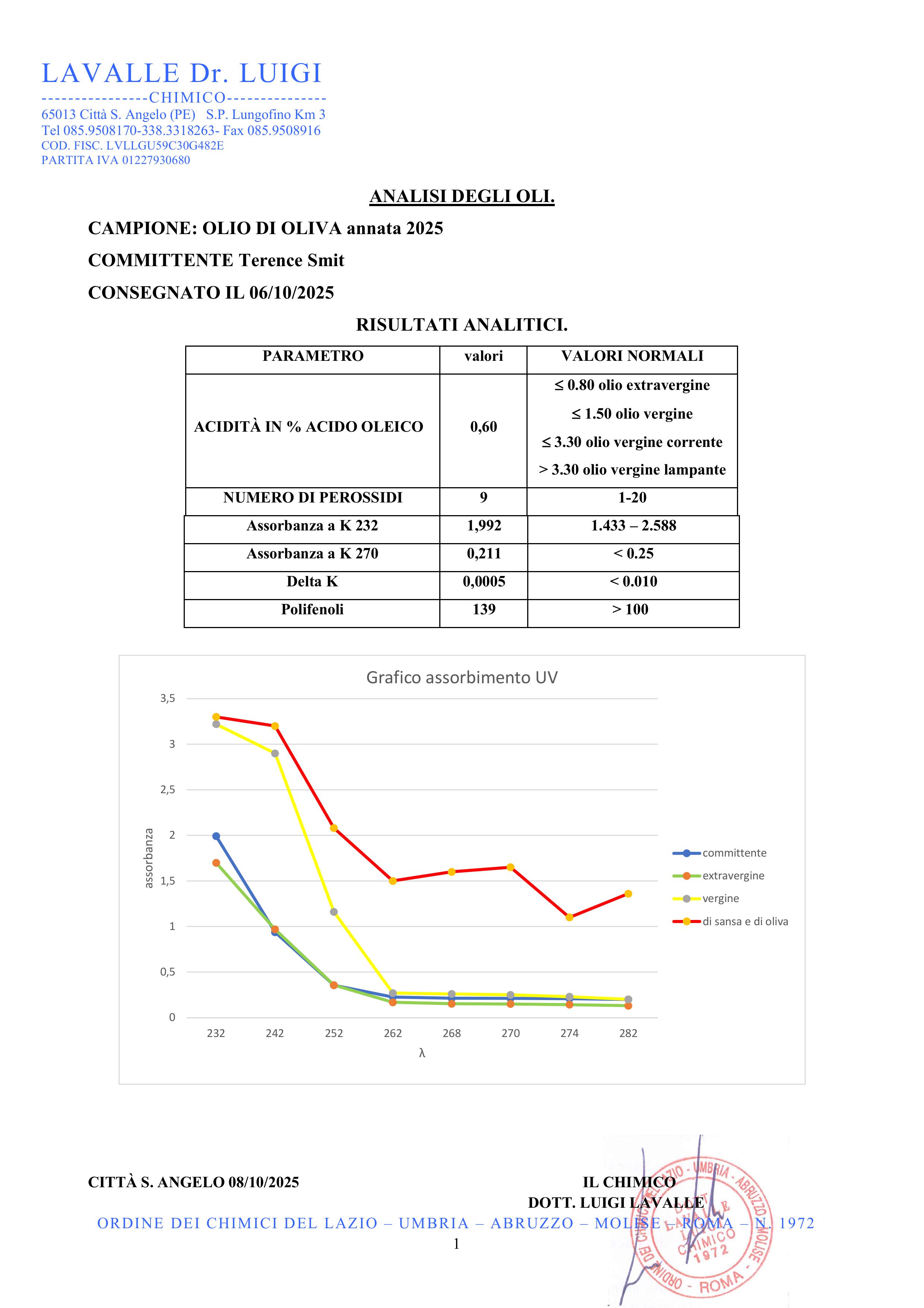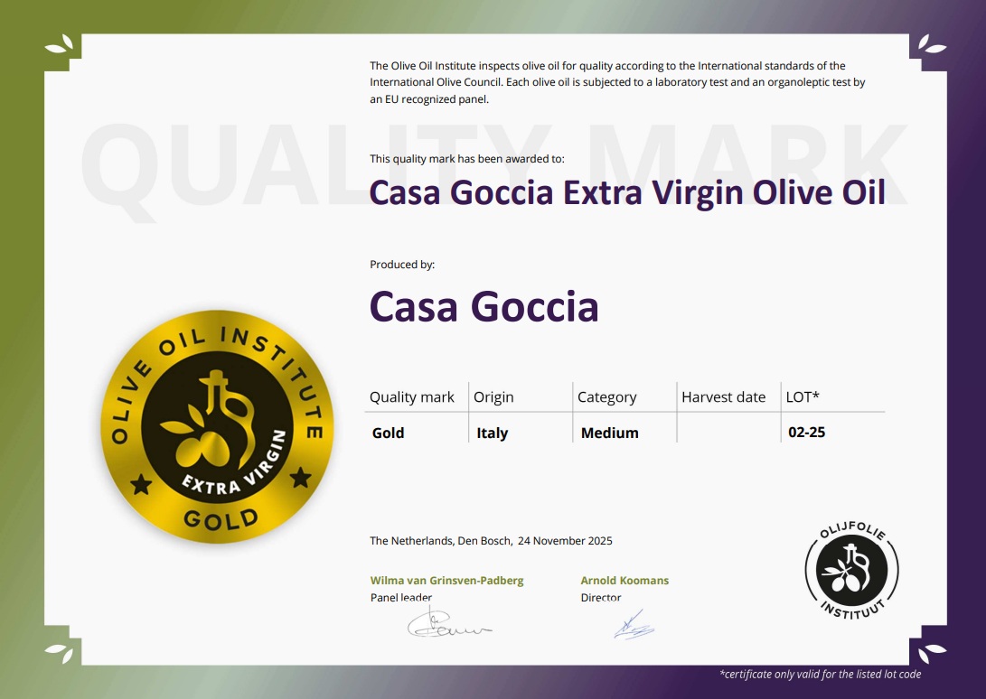 Onze olijfolie is in Italie officieel geanalyseerd en geclassificeerd als extra vergine. De hoogste kwaliteitscategorie die olijfolie kan behalen.